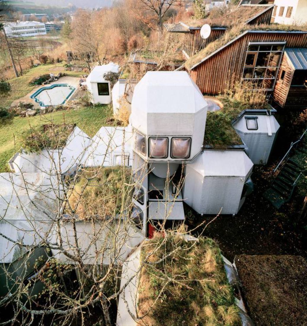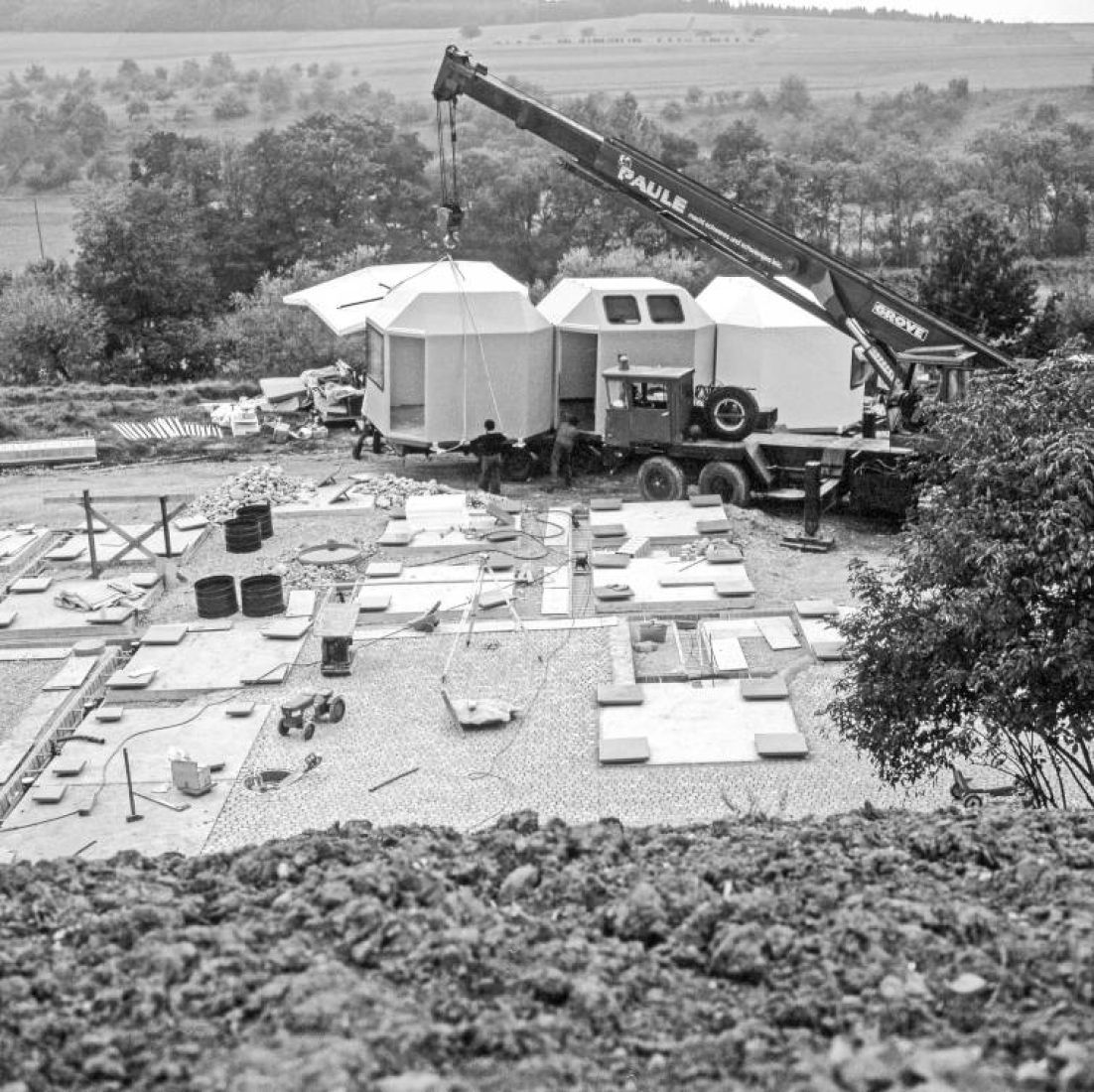 Am 5. November 1975 wurde in wenigen Stunden von 9 Uhr morgens bis 14.30 Uhr mittags das Wohnhaus von Peter und Bärbel Hübner und das Büro aus 23 Kunststoffpolyedern errichtet. Das Motto war: „Morgens kommen die Häuser, abends kommen die Gäste!“ Um 16 Uhr war die Pressekonferenz, drei WC’s, zwei Kühlschränke, sechs Telefone funktionierten, um 18 Uhr kamen 300 Gäste, am 6. November war normaler Alltag in einem Häuserhaus, bei dem es keine Trennung in Arbeiten und Wohnen gibt.