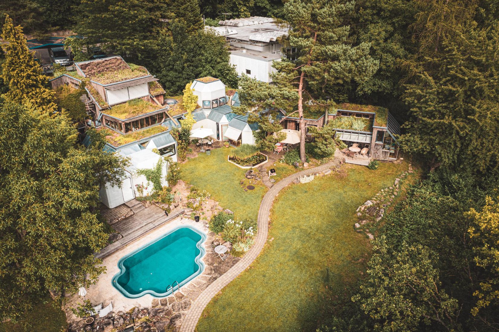 Heute sind wir verabredet. Es ist der 15. Oktober 2021. Ich parke am Ende der Goethestraße in Neckartenzlingen, Hausnummer 44. Ein Spaziergänger würde von hier aus nicht ahnen können, was sich nur wenige Treppenstufen den Hang hinunter befindet: ein Gebilde aus einzelnen architektonischen Modulen, genauer: Kunststoffpolyeder. Ein wenig erinnert es an ein mobiles Forschungszentrum in der Arktis. Polyeder an Polyeder erstreckt sich das Gebäude über den oberen Bereich des Hangs, der früher mal ein Steinbruch und dann eine Müllhalde war. Hier, am Rand eines Wohnviertels im Vorland der schwäbischen Alb, wirkt diese Architektur irgendwie fremd, aber gleichzeitig steht sie da wie selbstverständlich. Man könnte fast meinen dieses Gebäude wäre auf ganz natürliche Art und Weise hier hineingewachsen, als sollte es so sein. Mittlerweile gibt es mehrere Anbauten aus Holz – weitgehend in Selbsthilfe gebaut. Diese Kombination aus industriell gefertigten Kunststoffpolyedern und selbstgebauten Holzkonstruktionen ist fast schon ein Sinnbild für die Entwicklung, die auch Peter in seiner Arbeit durchlebt hat.