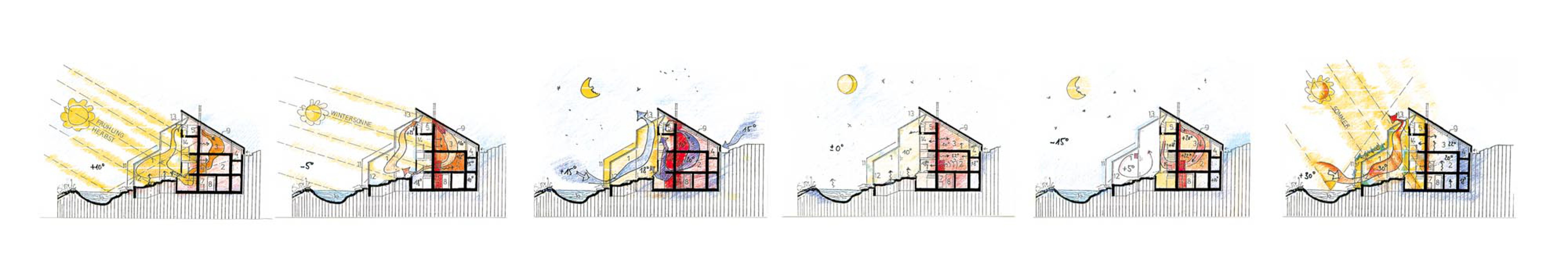 Die Idee, dass das Haus als Wärmespeicher der Sonne funktioniert, hat uns aber kurz vor Fertigstellung nochmal genervt: Damit das Haus als Wärmespeicher funktioniert, musste viel Masse verbaut werden. Ohne Masse kann keine Energie gespeichert werden. Also haben wir 500 Tonnen Material verbaut, und das während einem kalten Winter mit -20 °C. Das Glashaus wurde erst im Februar geliefert und die Wendels sind im März eingezogen, aber das Kernhaus war dann wegen der extremen Temperaturen praktisch tiefgefroren. Wir hatten schon gedacht wir haben alles falsch gemacht. Überall haben wir provisorisch Heizungen aufgestellt. An den Wänden lief richtig Wasser herunter. Es hat dann bis Juni gedauert bis das Haus aufgeheizt und trocken war. Und dann, endlich, ging das Konzept auf. Erst vorgestern war ich dort – wir sind noch immer beste Freunde – und die heizen im Moment noch weitgehend alles mit der Sonne. Das funktioniert wunderbar.