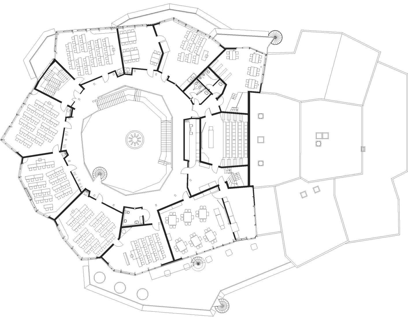 Der Hauptbau der Freien Waldorfschule in Köln Chorweiler setzt in radialer, dreigeschossiger Anordnung die Aula quasi als Schwanz in Gegensatz zum Kopf mit den Klassenräumen. Die von diesen umgebene zentrale Halle ist das Herzstück der Schule, sie dient sowohl als großer gemeinschaftlicher Treffpunkt wie auch als Foyer. Das eindrucksvolle Glasdach wird von einer baumartigen Stütze getragen und lässt Licht und Sonne herein; zugleich dient die Halle als Lüftungsschacht, der den Kamineffekt nutzt, um aufsteigende Luft durch Auslässe oben abzuführen und Frischluft von unten anzusaugen.