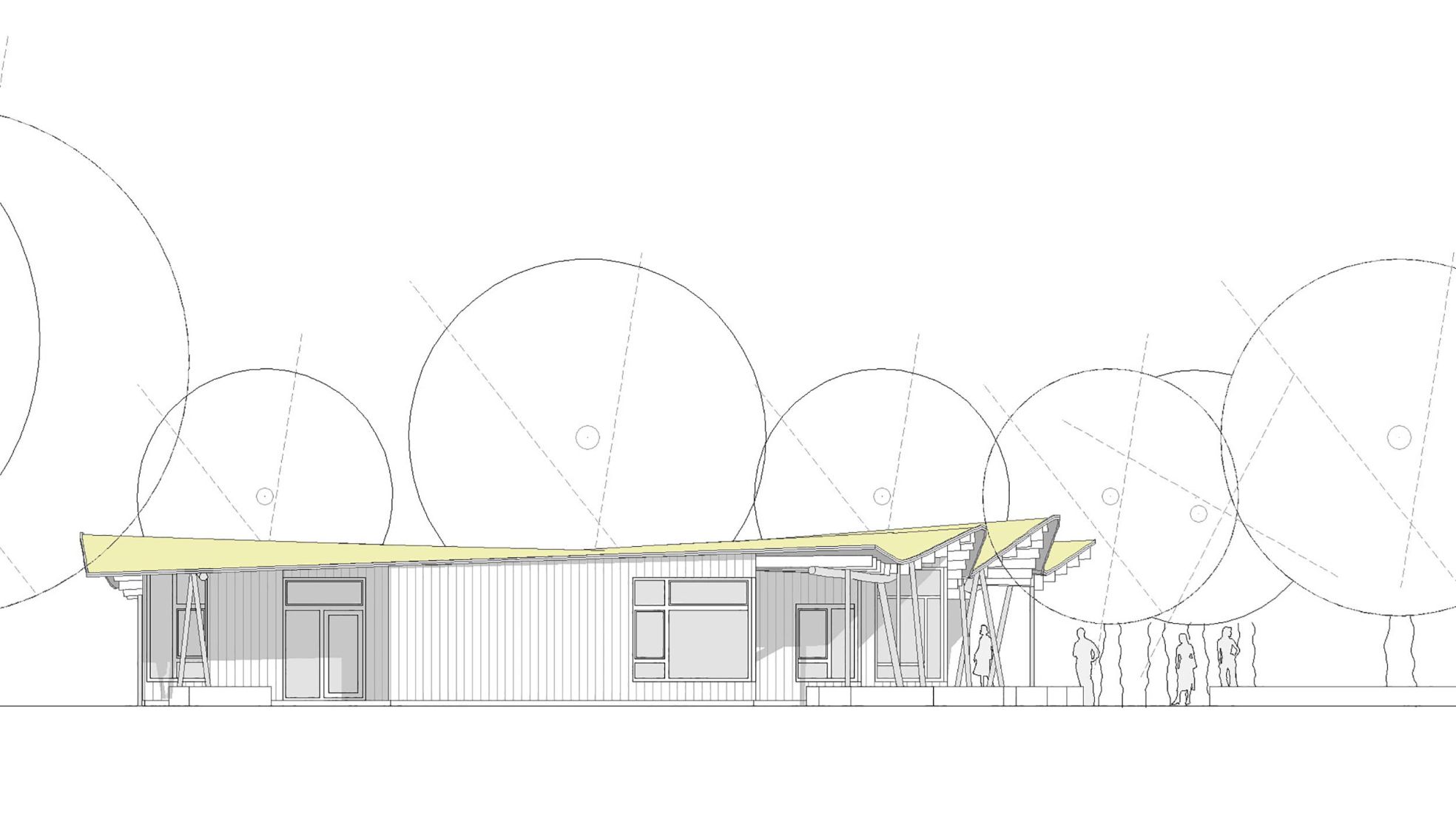 Das von der angrenzenden Berufsschule gut einsehbare Dach wird zur fünften Fassade erkoren und wird wichtigstes Identität stiftendes Merkmal. Das kleine, vermeintlich unwichtige Gebäude zelebriert seine Nutzer und ist Ausdruck ihrer Bedeutung für die Gesellschaft.
