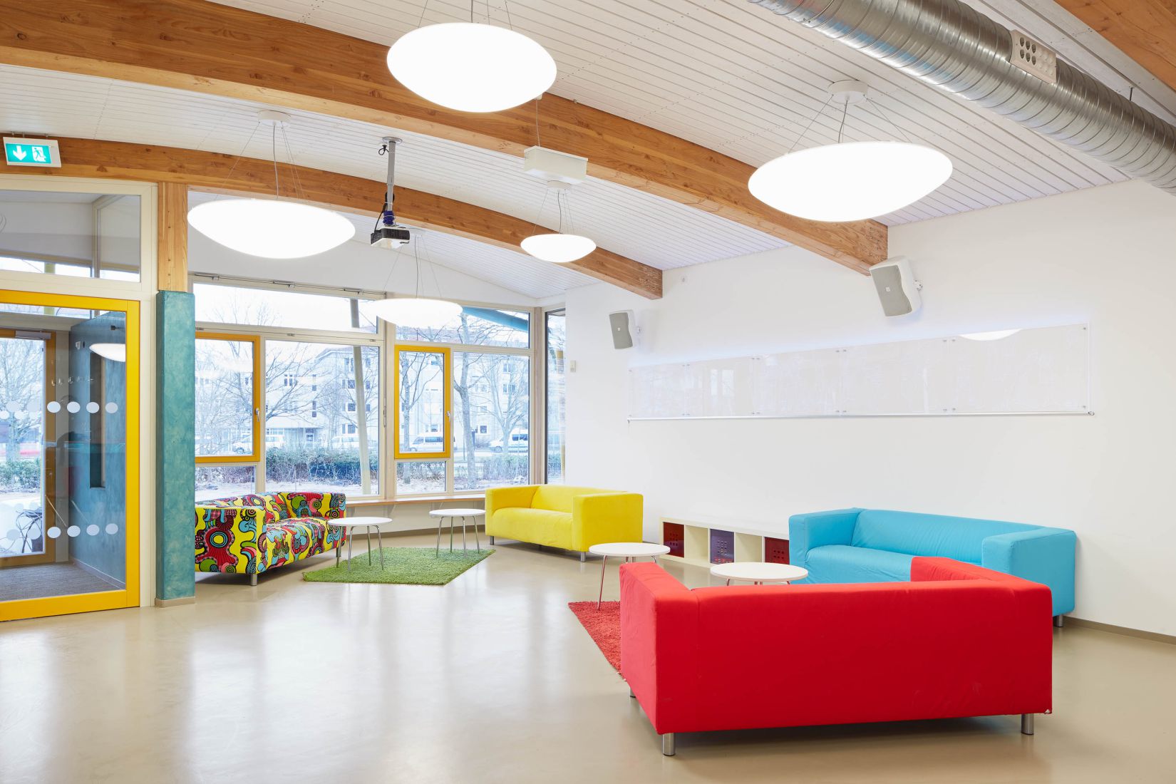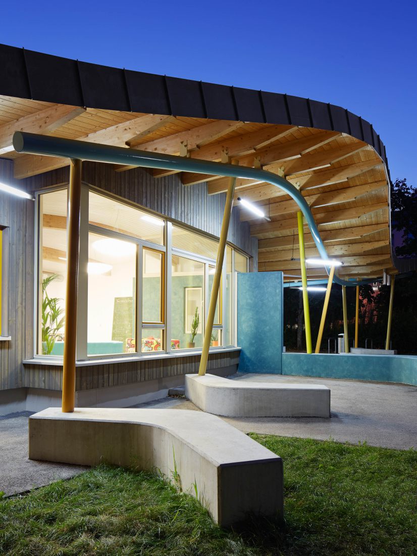 Das Leitmotiv für dieses Jugendhaus im Südwesten von Karlsruhe war ein „fliegender Teppich“. Dieser ist in Form eines frei geschwungenen Daches im Gebäude zu erkennen. Verwerfungen im Dach, welche die Textile Anmutung erzeugen gliedern gleichzeitig den Innenraum.