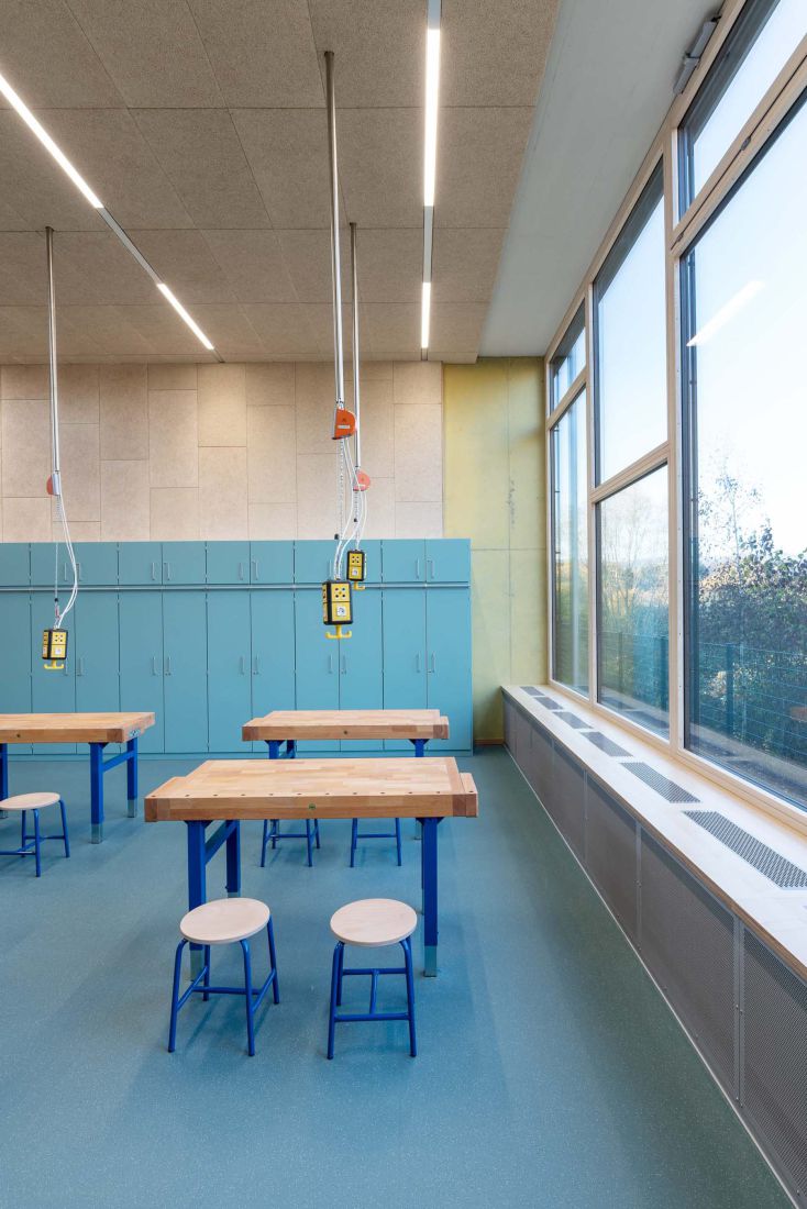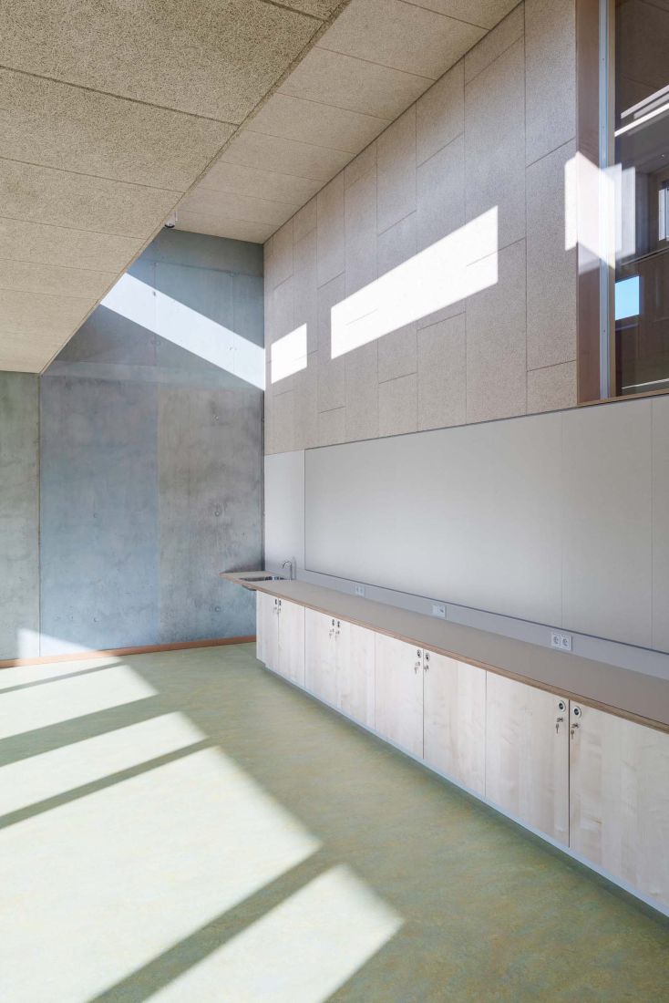 Ein großer Augenmerk wird auf die natürliche Belichtung der Klassen gelegt. Dafür wird der mittlere Teil der „Klassenfinger“ angehoben (Laterne) so dass damit die tiefen Klassen auch in der Tiefe natürlich belichtet werden. Gleichzeitig unterstützt dieser Aufbau als Kamin die natürliche Belüftung der Räume. Die Decken sollen größtenteils sichtbar bleiben und über eine Nachtauskühlung die Speichermasse als thermische Masse zur Verfügung stellen.