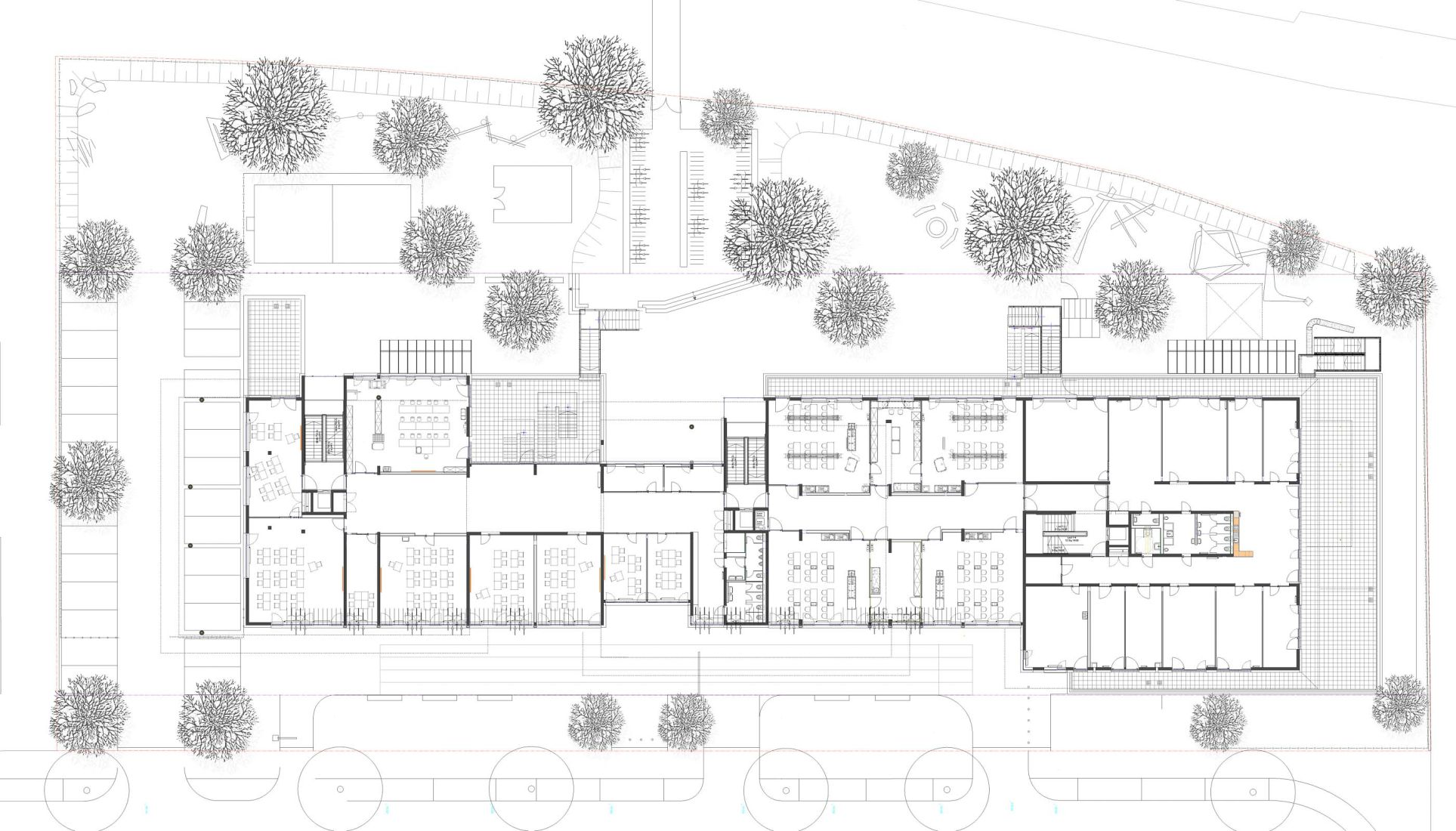 Die Mensa verbindet die beiden Bauabschnitte und kann auch für Aulaveranstaltungen genutzt werden. Das Theater des Kindergartens kann der Aulanutzung als Bühne zugeschaltet werden.