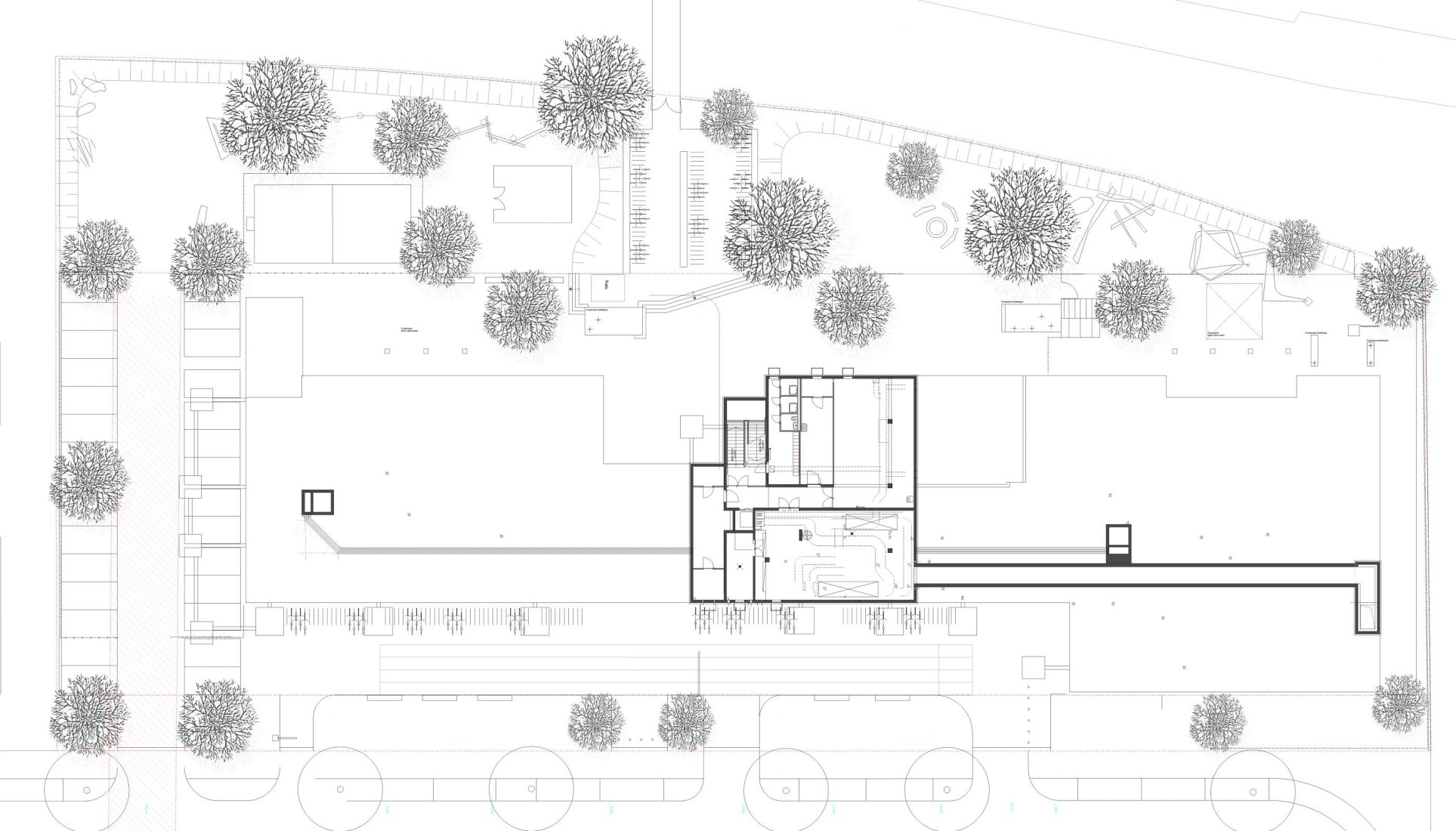 Die Zugänge sind durch überkragende Baukörper überdacht. Erdgeschossig sind die Verwaltung, Bibliothek und die Holzwerkstatt angeordnet.