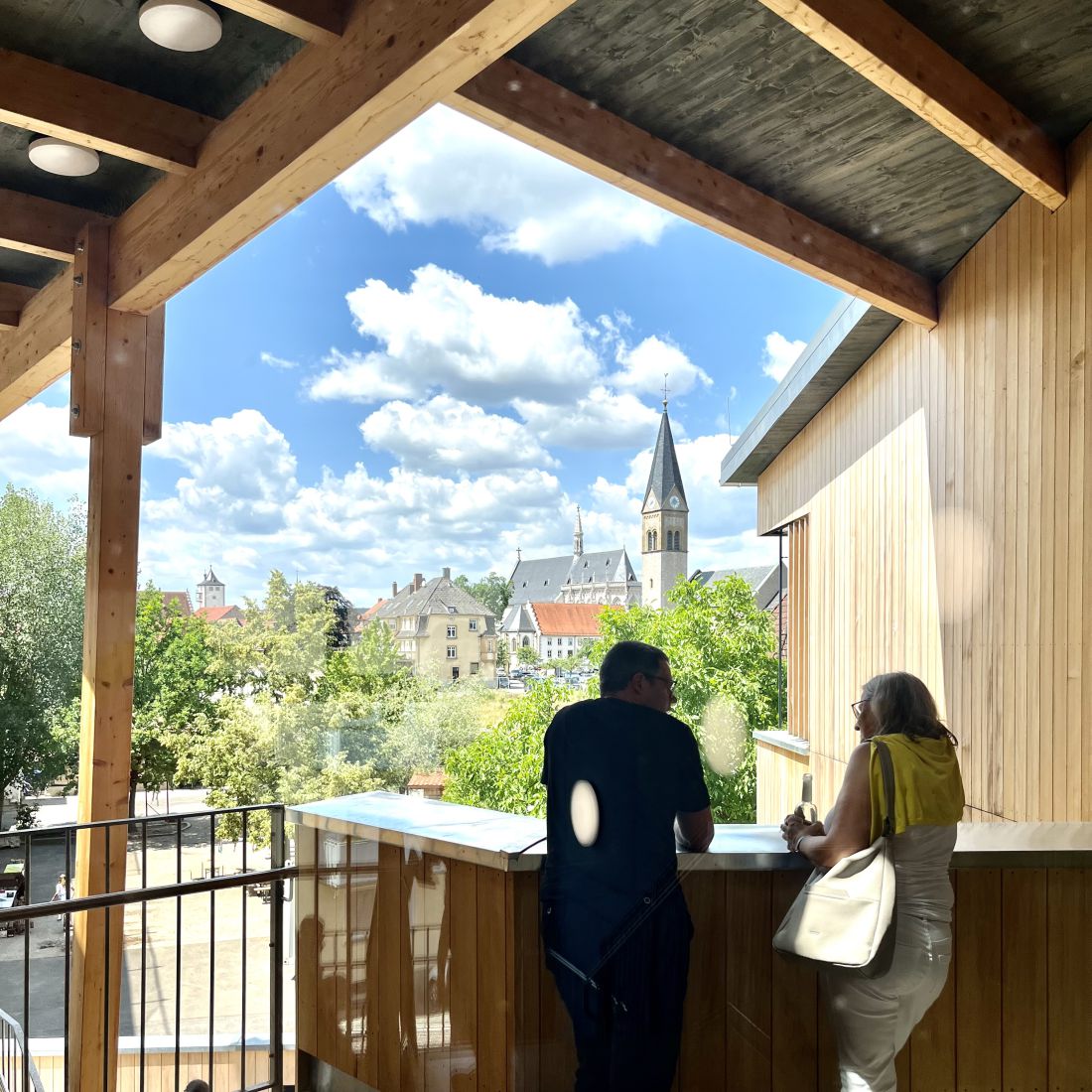 Gestalterisch wird das Gebäude von seiner vertikalen Holzfassade und dem durchgehenden Sockel aus fränkischem Sandstein geprägt. Letzterer wurde vollständig aus den Steinen des abgebrochenen Altbaus wiederverwendet und verankert das Gebäude sichtbar mit dem Ort. Große Fensterflächen gliedern die Fassaden rhythmisch, schaffen lichte Innenräume und ermöglichen vielfältige Ausblicke. Einzelne vertikale Holzlamellen setzen feine Akzente im Fassadenbild.
