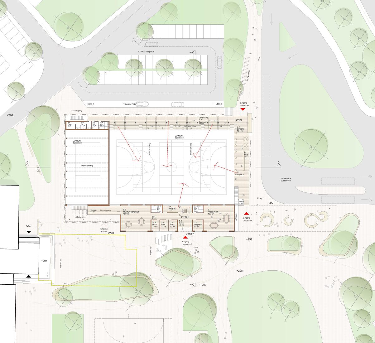 Das Gebäude nutz die vorhandene Topografie. Der Zugang der Sportler und SchülerInnen erfolgt hauptsächlich auf dem unteren Niveau, aus Richtung der Schule. Der Zugang für Besucher erfolgt von Norden aus Richtung des Ortskerns auf dem Niveau des Metzinger Straße.