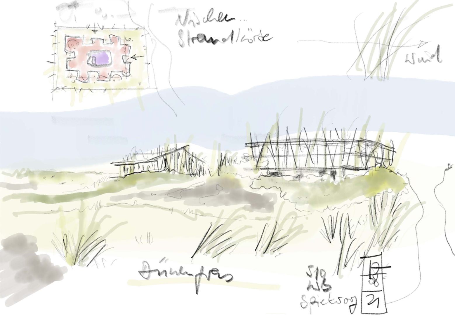 Das Ensemble aus neuer Strandhalle und Wohnunterkunft soll ein natürlicher Teil der Dünenlandschaft werden, dennoch selbstbewusst und markant, vom Ort und auch vom Strand kommend klar als Sonderbau zu erkennen.
