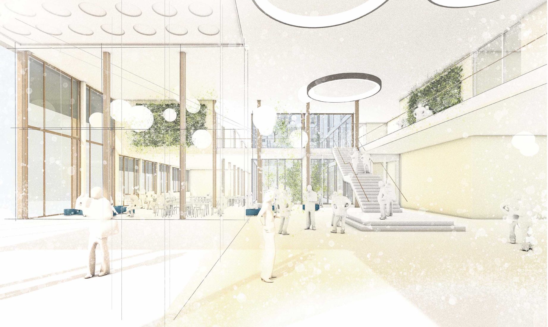 Das Gebäude soll neben begrünten Dachflächen auch mit begrünten Fassaden und Begrünungen im Innenraum versehen werden… das Gebäude als Teil des Grünzugs.