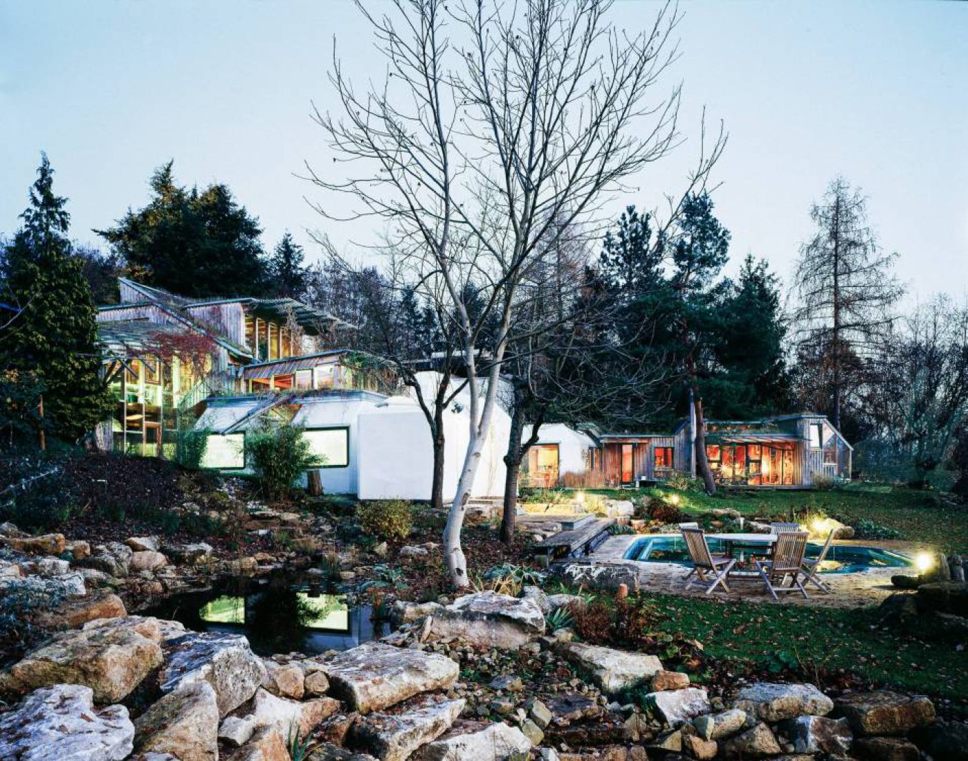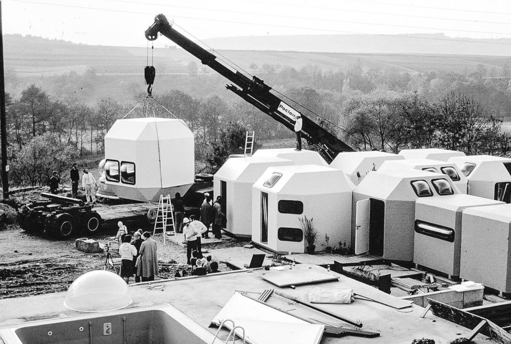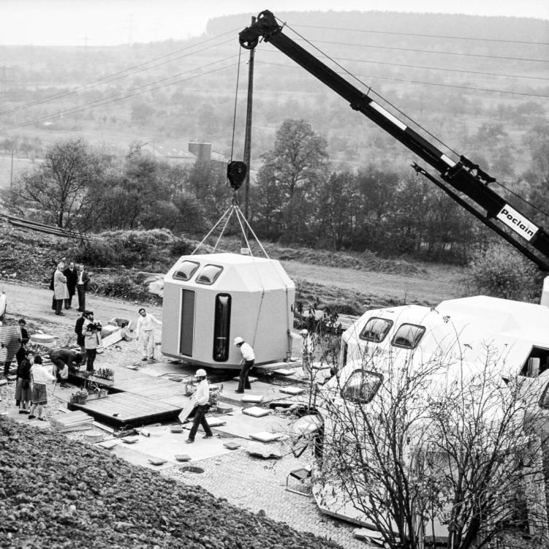 Am 5. November 1975 wurde in wenigen Stunden von 9 Uhr morgens bis 14.30 Uhr mittags das Wohnhaus von Peter und Bärbel Hübner und das Büro aus 23 Kunststoffpolyedern errichtet. Das Motto war: „Morgens kommen die Häuser, abends kommen die Gäste!“ Um 16 Uhr war die Pressekonferenz, drei WC’s, zwei Kühlschränke, sechs Telefone funktionierten, um 18 Uhr kamen 300 Gäste, am 6. November war normaler Alltag in einem Häuserhaus, bei dem es keine Trennung in Arbeiten und Wohnen gibt.