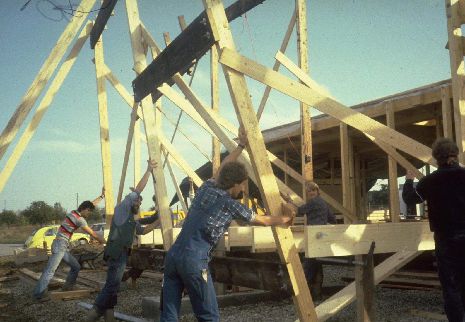 Das ganze hat angefangen mit dem Bauhäusle, dann kam das Jugendhaus Wangen, das Jugendhaus Herrenberg, das Jugendhaus in Stammheim, in Möglingen, und so weiter. Eins baute auf dem anderen auf, aber nicht formal. Bei den Herrenbergern war das z.B. so, dass die Jugendlichen zu mir kamen und sich sicher waren, dass sie auch auf jeden Fall selbst bauen möchten, aber dass es auf gar keinen Fall an irgendeiner Ecke so aussehen dürfte wie in Wangen. In jener Zeit haben wir das über Geschichten aufgelöst. Wir haben also gemeinsam mit den Jugendlichen, die so zwischen 16 und 20 Jahren alt waren, eine Idee entwickelt, die man in Worte fassen konnte. Beim Jugendhaus Wangen war das beispielsweise die Burg. Und eine Burg besteht aus einer dicken Wand. Und die dicke Wand schützt die Akteure, die Jugendlichen, vor dem Lärm der Schnellstraße und gibt die Möglichkeit innen eine eigene Welt zu schaffen. In Herrenberg kam dann die Idee des Zirkus auf mit einem zentralen Bau und eine Reihe an Zirkuswägen, die rundherum angedockt sind. In Möglingen wurde es die fliegende Untertasse. Und so hat jedes Projekt ein eigenes Thema gehabt, das sich auch als unheimlich nützlich in der Kommunikation erwiesen hatte. Einerseits wurden die Themen von der Presse aufgenommen, aber auch die Jugendlichen konnten so ihren Eltern und Freunden erzählen, was da entstand, ohne irgendeinen Plan zu brauchen. Jeder hatte sofort Bilder im Kopf. Als Laie kannst du mit einem Grundriss meistens sowieso nichts anfangen.
