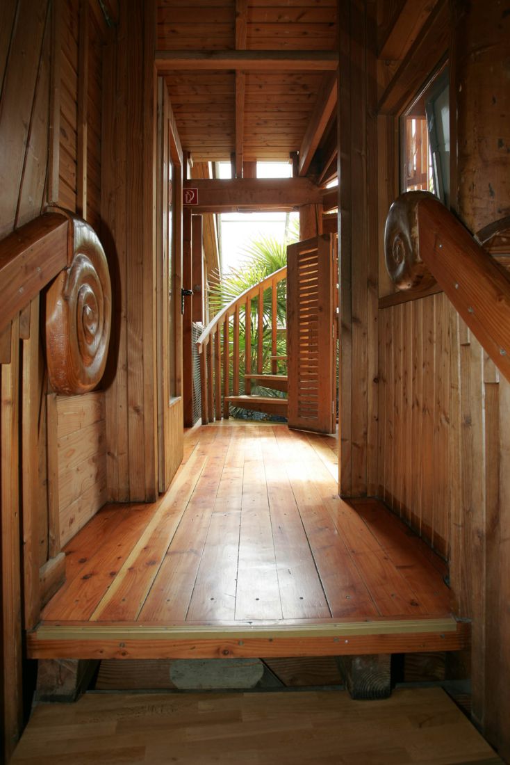 "Ein drittes wichtiges – und vielleicht das eindrucksvollste – Element der Anlage ist das später erbaute Dinosauriercafé, welches auf einem seltsam geformten Leimholzbinder basiert oder von ihm inspiriert wurde. Er war von einer anderen Baustelle übriggeblieben und bildet das Rückgrat des Tiers."