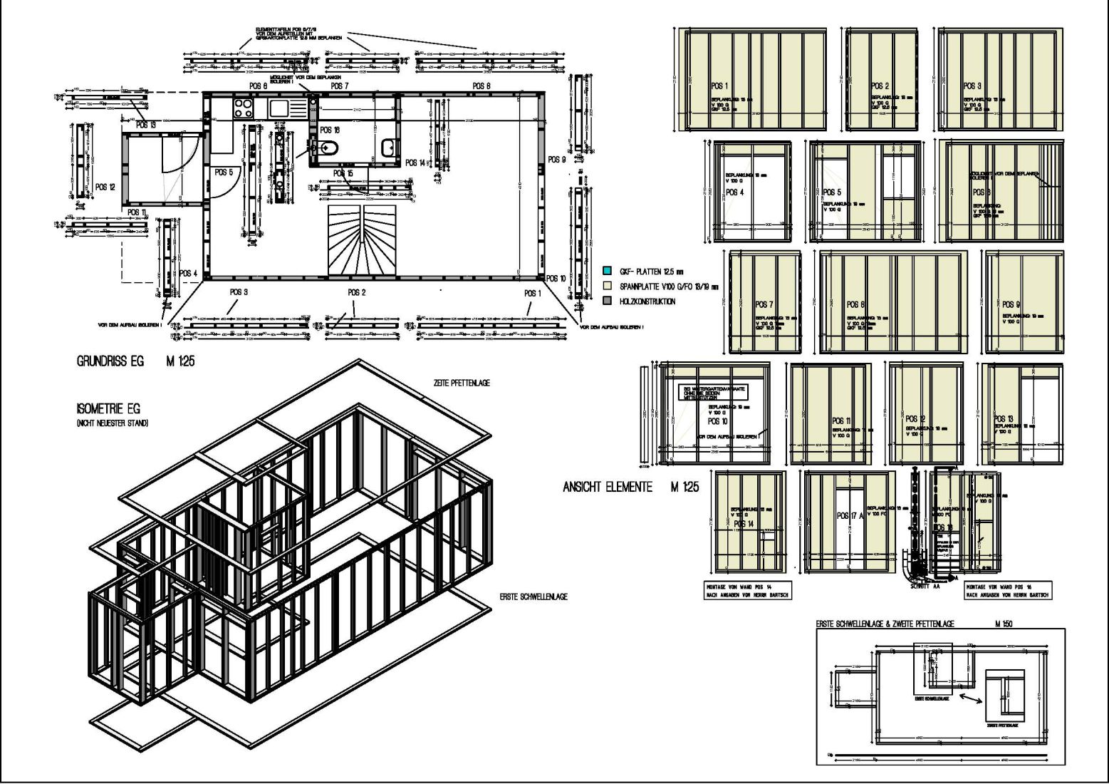 Die Häuser wurden auf Bodenplatten ganz in Holzrahmenbauweise, mit horizontaler Holzverkleidung und leicht geneigten Grünflächen auf Foliendächern erstellt. Die Grundrisse mussten einfach und rechtwinklig sein, die Räume und Verkehrsflächen sinnvoll geplant werden, um den verfügbaren Platz am besten auszunutzen zu können. Jedoch wurde öde Monotonie im Gesamtplan vermieden, indem Varianten der Haustypen und der Hausbreite und auf Wunsch auch zusätzliche Elemente wie Wintergärten oder Abstellschuppen zugelassen waren. Ein in der Vergangenheit häufig genutzter Vorzug des Holzskeletts ist die Möglichkeit, das Obergeschoß über das Erdgeschoß auskragen zu lassen, dadurch können die tiefen Schlafräume einiger Häuser über den knapperen Eingangsbereich herausragen und geschützte Bereiche sowie gegliederte Fassaden bilden. Die Gründächer haben »Schmetterlings«-Form; sie sind zu einer mittigen Ablaufrinne geneigt, speichern jedoch einen Teil des Regenwassers, bevor der Rest abfließt. In diesem Teil des Daches kann leicht ein zentrales Oberlicht über dem Bad eingefügt werden. Die Wirkung des Daches als behütendes, schützendes Element wird am Außenrand durch überstehenden hölzernen Sonnenschutz noch verstärkt. Um die Realisation des Hauses auch für unerfahrene Eigenbauer möglich zu machen, wurde ein Konstruktionssystem aus standardisierten, rechtwinkligen Tafeln entworfen, die eine nach der anderen temporär auf der Baustelle vorgefertigt werden konnten. Obgleich jede Familie die Innenausstattung ihres eigenen Hauses ausführen durfte, wurde die Primärkonstruktion in organisierter Gruppenselbsthilfe erstellt, weil zum einen dazu mehr Muskelkraft erforderlich war und zum anderen die Eigenbauer dadurch voneinander lernen konnten. Durch diese Erfahrung entstand ein starkes Gemeinschaftsgefühl, noch ehe die Häuser fertiggestellt waren, und es wurde eine Nachbarschaftsbeziehung kultiviert, die immer seltener wird, weil die Menschen häufiger umziehen und für sich bleiben. Vielleicht lernt man letztlich auf einer Baustelle mehr vom normalen Leben als von guter Architektur, denn es ist eine Gemeinschaft von befreundeten Familien mit relativ geringem Einkommen entstanden, die eigene Häuser etwa zum Mietpreis einer Wohnung erwerben konnten, und die Bauten sind umweltfreundlich sowohl im Bau wie auch im täglichen Betrieb. In ästhetischer Hinsicht zeigen sie eine spartanische Eleganz.