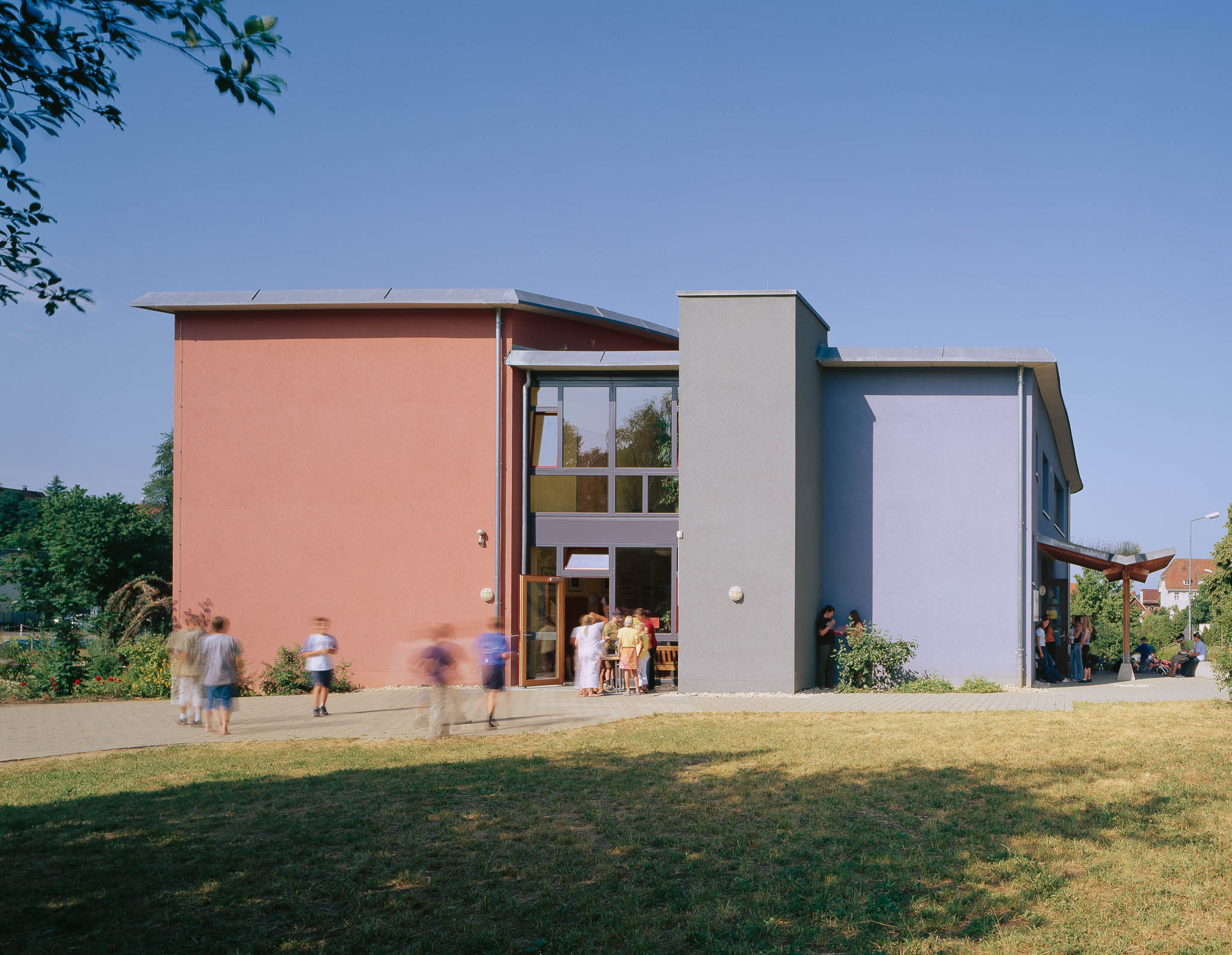 Der Riegel ist in mehrere, aneinander gerückte Baukörper unterteilt, die nach verfügbarem Budget in mehreren Abschnitten errichtet wurden. Außerdem wirkt sich diese Unterteilung vorteilhaft auf seine Proportionierung aus, lässt das Gebäude schmaler erscheinen und die einzelnen Funktionen innerhalb werden ablesbar. Im der Straße zugewandten Volumen ist die Verwaltung sowie eine Bühne untergebracht. Darüber befinden sich naturwissenschaftliche Räume und über ein Staffelgeschoss abgesetzt, die Klassenräume für Musik und Zeichnen. Die übrigen Klassenräume sind im Roten Baukörper untergebracht und orientieren sich in Richtung Garten. Ihre Höhen orientieren sich an der Topografie des Geländes. Die Werkstätten gliedern sich an Aula und Sporthalle an und öffnen sich nach Süden hin zu einem Werkhof im Freien.