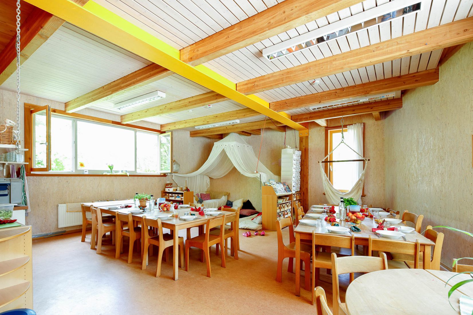 Im Obergeschoss befinden sich ein weiterer Hortraum und ein Mehrzweckraum, der für alle Gruppen zur Verfügung steht. Des Weiteren befinden sich hier ein Büro, ein Personalraum und ein kleiner Raum für spezielle pädagogische Arbeit.
