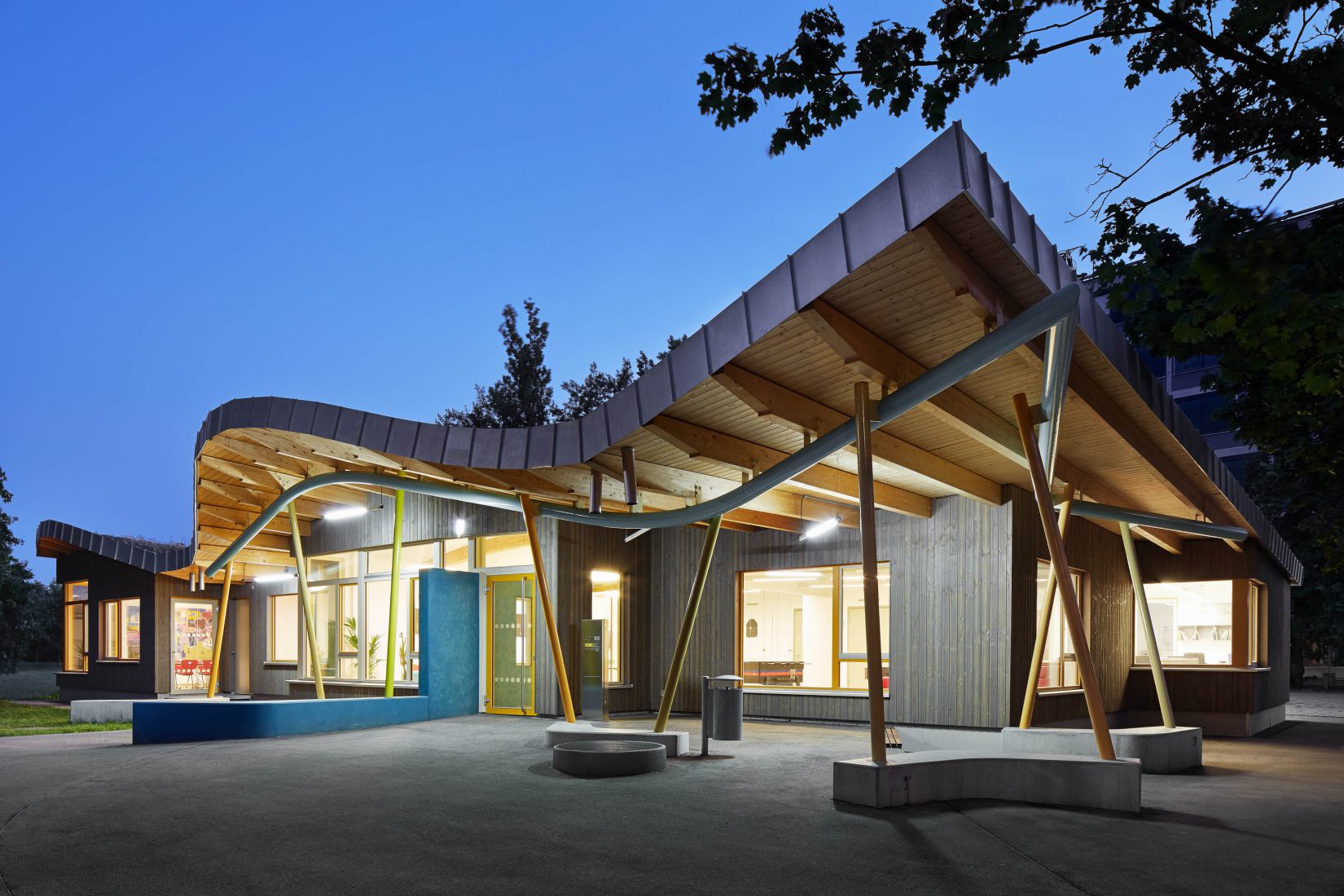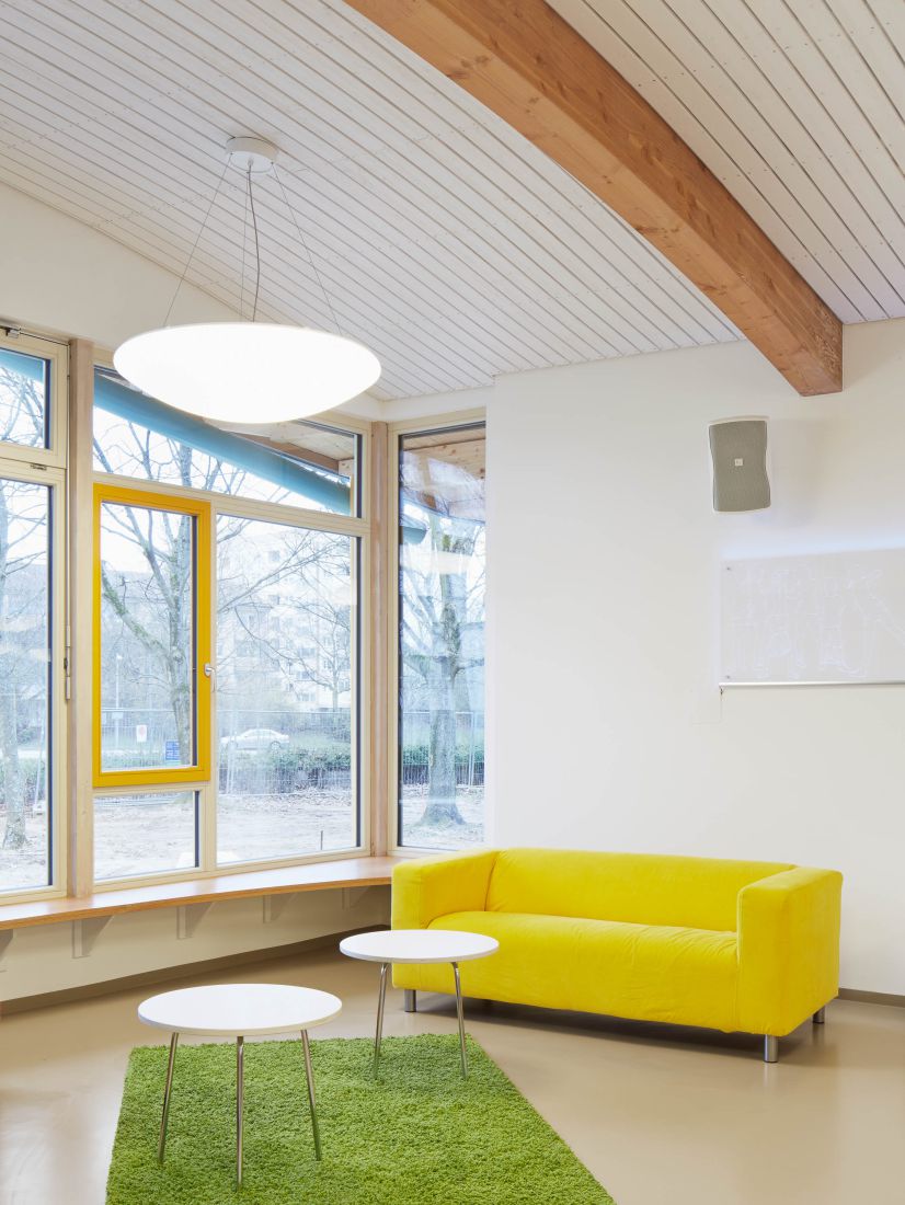 Das Leitmotiv für dieses Jugendhaus im Südwesten von Karlsruhe war ein „fliegender Teppich“. Dieser ist in Form eines frei geschwungenen Daches im Gebäude zu erkennen. Verwerfungen im Dach, welche die Textile Anmutung erzeugen gliedern gleichzeitig den Innenraum.