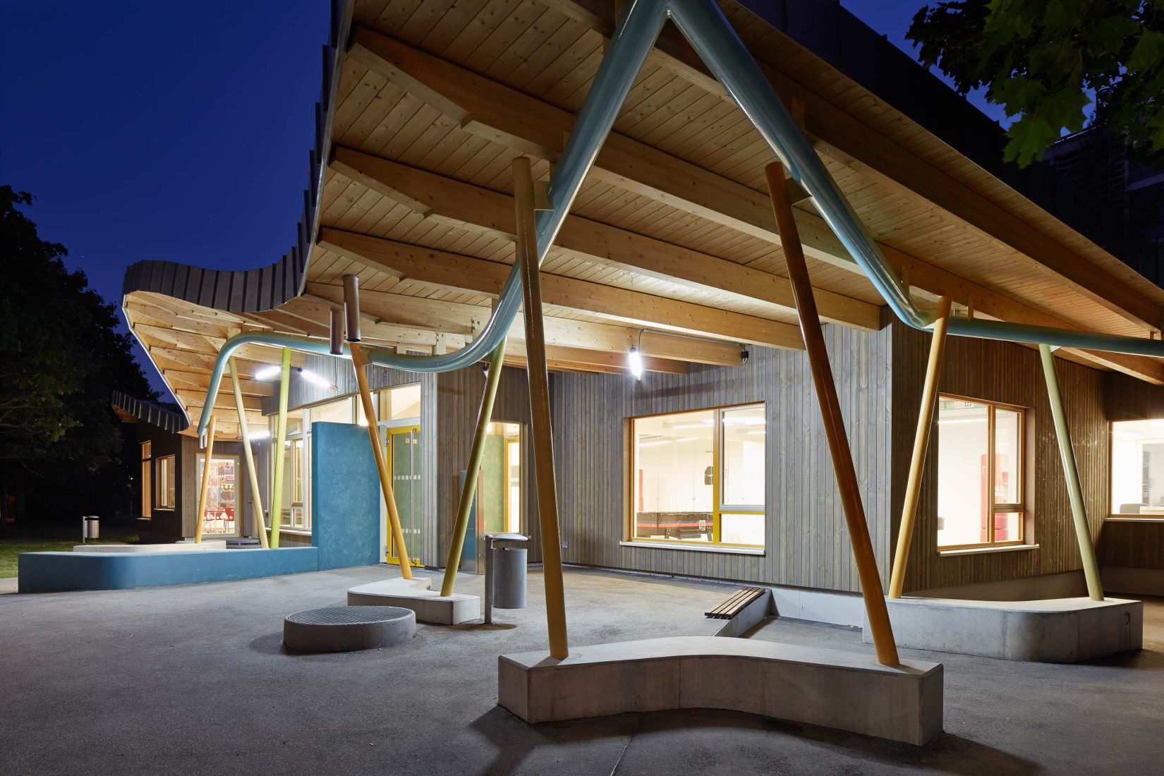 Das von der angrenzenden Berufsschule gut einsehbare Dach wird zur fünften Fassade erkoren und wird wichtigstes Identität stiftendes Merkmal. Das kleine, vermeintlich unwichtige Gebäude zelebriert seine Nutzer und ist Ausdruck ihrer Bedeutung für die Gesellschaft.