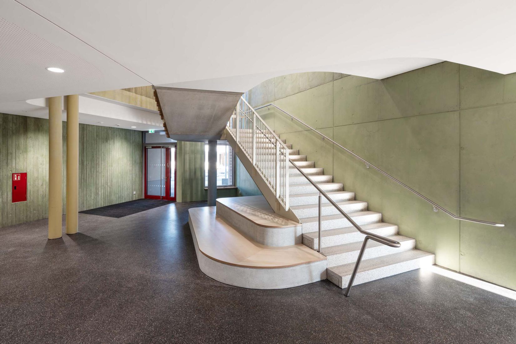 Um den Innenhof sind Raumnutzungen angeordnet, die das gemeinsame einer Schule ausmachen, die Aula mit ihren vor gelagerten Aufenthaltsräumen, die Naturwissenschaft, die Schulleitung, die Bibliothek, dem Kiosk angegliedert an die Lehrküchen und gegenüber, als Rücken, die Sporthalle mit den Umkleideräumen.