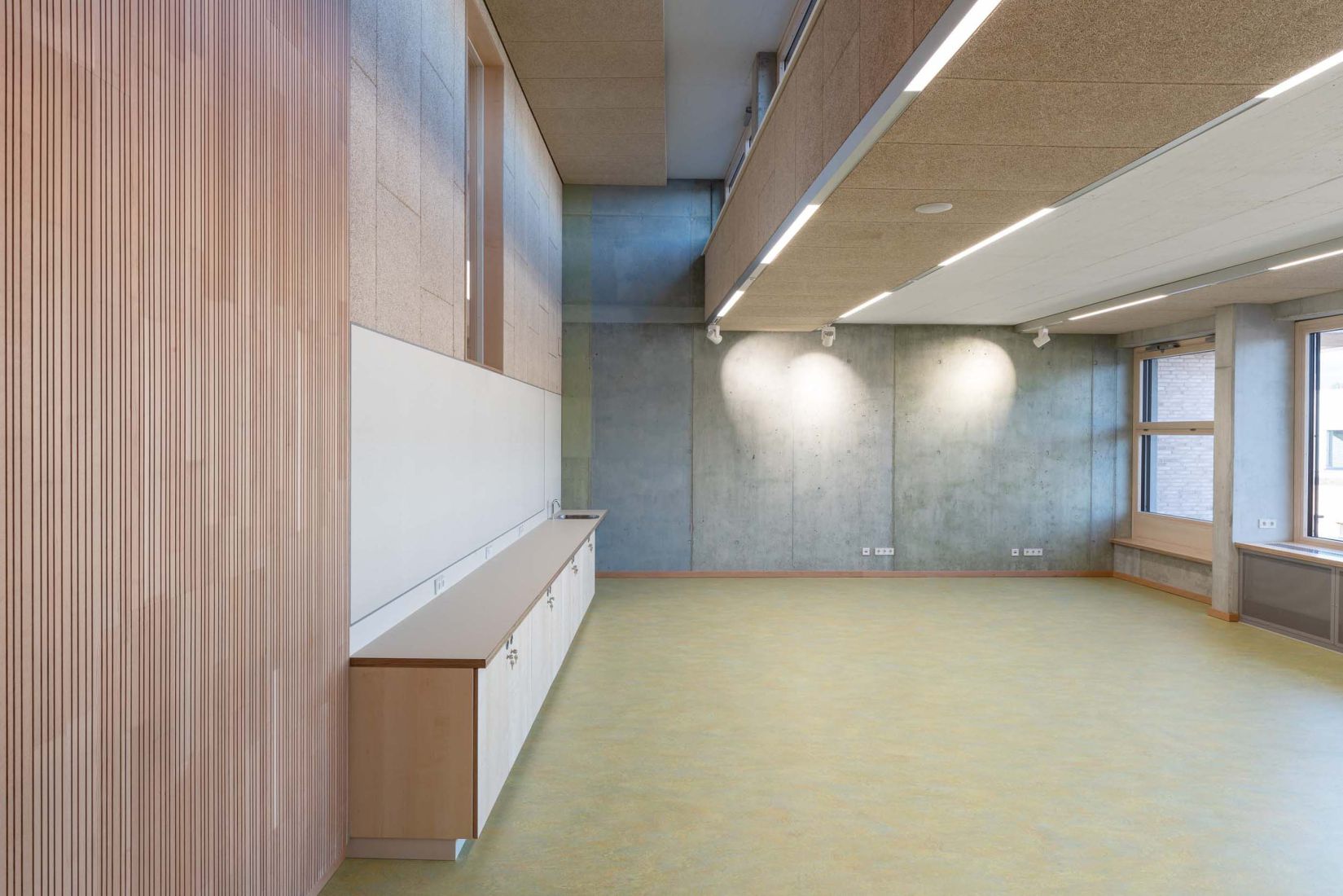Ein großer Augenmerk wird auf die natürliche Belichtung der Klassen gelegt. Dafür wird der mittlere Teil der „Klassenfinger“ angehoben (Laterne) so dass damit die tiefen Klassen auch in der Tiefe natürlich belichtet werden. Gleichzeitig unterstützt dieser Aufbau als Kamin die natürliche Belüftung der Räume. Die Decken sollen größtenteils sichtbar bleiben und über eine Nachtauskühlung die Speichermasse als thermische Masse zur Verfügung stellen.
