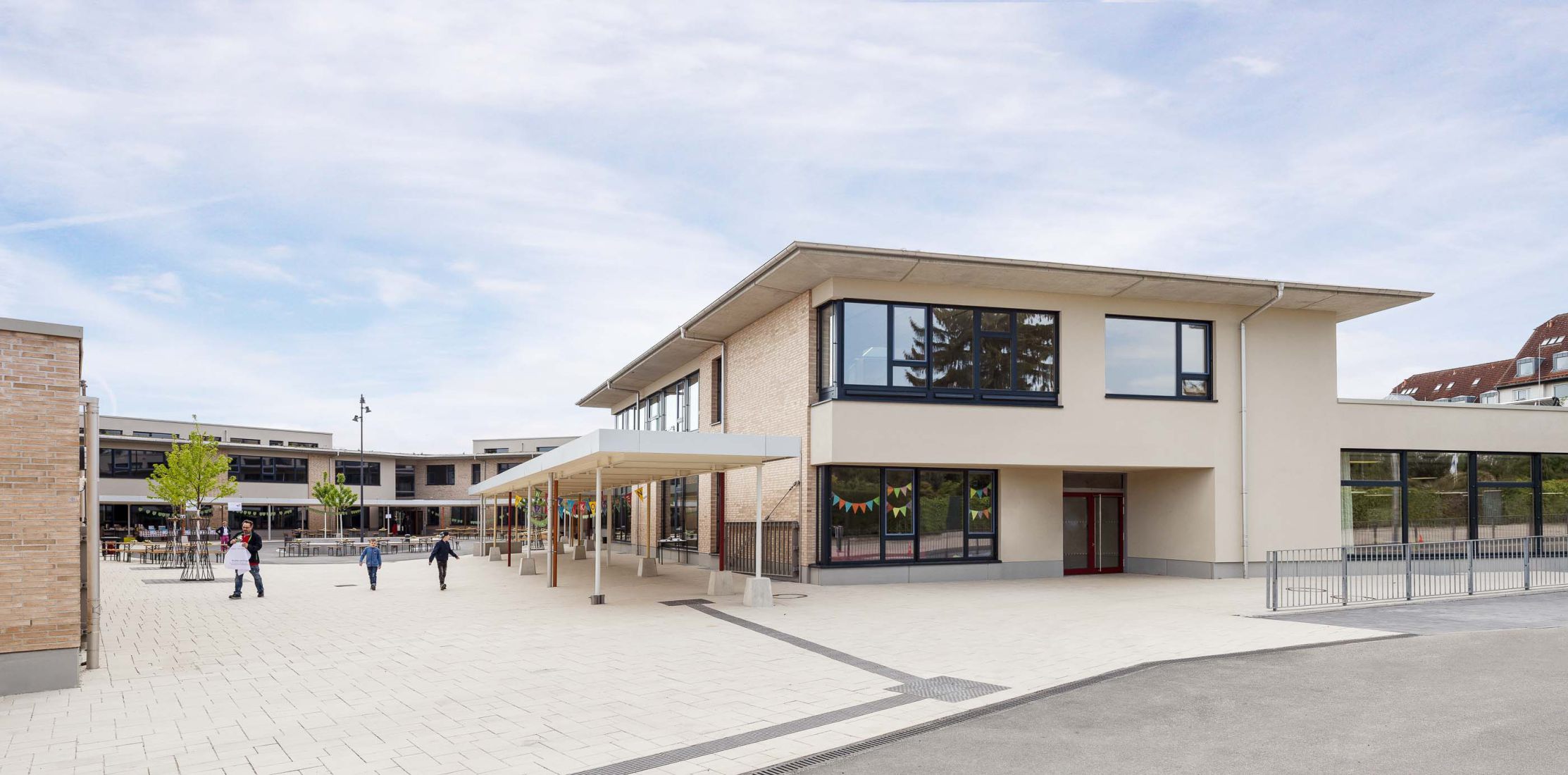 Die Anordnung der Baukörper bildet nach Außen eine strahlenförmig Figur, die sich mit dem landschaftlichen Teil des Grundstücks verzahnt. Die Nutzungseinheiten sind dadurch gegliedert. Im Westen entlang der Mainstrasse entwickelt sich der Küchentrakt. Die Ver.- und Entsorgung erfolgt von der Stirnseite, über den Anlieferungshof ohne den sonstigen Schulbetrieb zu belästigen. Nach Ost reihen sich die Baukörper der Unterrichtsklassen wie Pavillons. Die Unterrichtsräume haben jeweils einen eigenen Ausgang (Fluchtweg) in den landschaftlichen Teil des Außenanlagenkonzeptes.