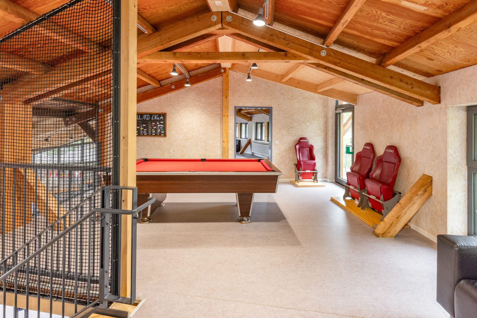 Von den tragenden Elementen bis hin zur Innenraumgestaltung – Holz prägt das Erscheinungsbild des Jugendhauses. Große Holzbalken, warme Wandverkleidungen und eine sichtbare Holzarchitektur verleihen dem Gebäude eine gemütliche und moderne Atmosphäre. Auch die Möbel und Details im Innenraum greifen das Material auf und schaffen eine harmonische Verbindung zwischen Architektur und Nutzung.