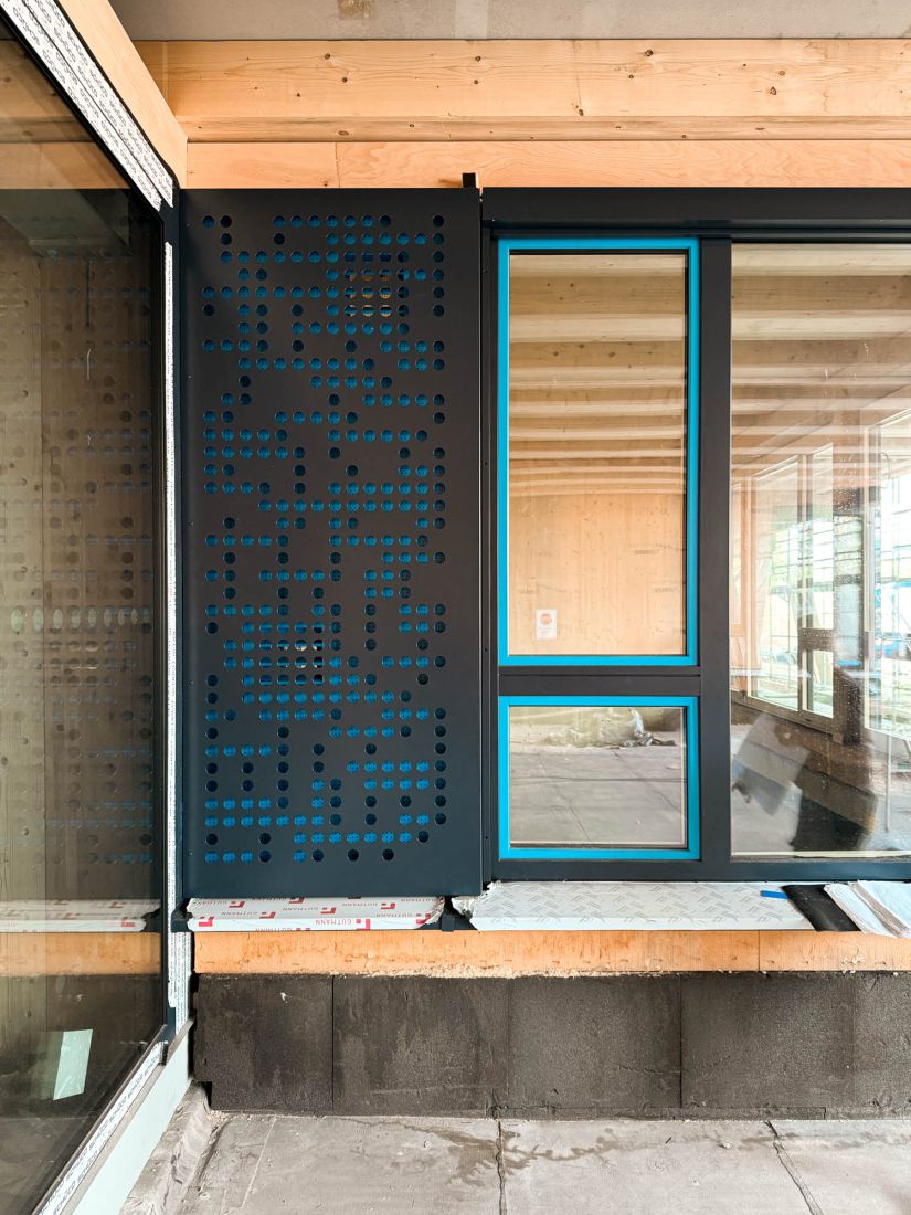 Der Mehrzweckraum wird im Raumverbund mit dem Musikraum als solitärer Baukörper zentral auf dem Pausenhof platziert. Dieser ist im Norden an die bestehende Schule angeschlossen. Der neu entstandene Veranstaltungsraum dient somit der gesamten Schulgemeinschaft und bildet zusammen mit dem zentralen Schulhof das neue Herz der Schule.