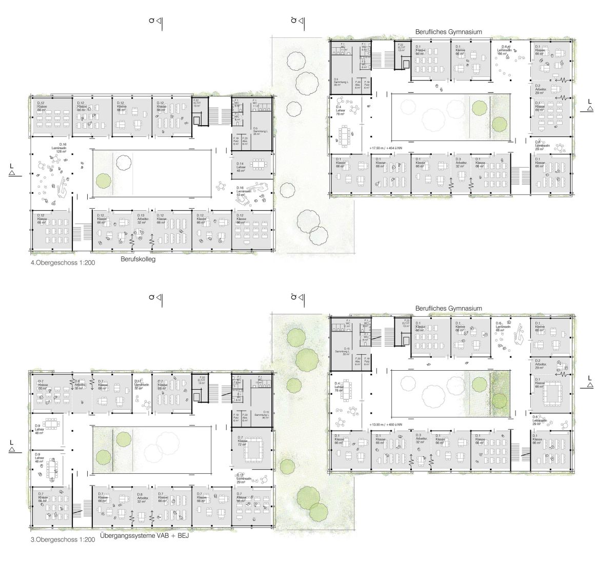 Durch die jeweils etwas differierenden Raumprogramme unterscheiden sich die Grundrisse der Lernbereiche, vor allem die Position der freien Lerninseln ist unterschiedlich.