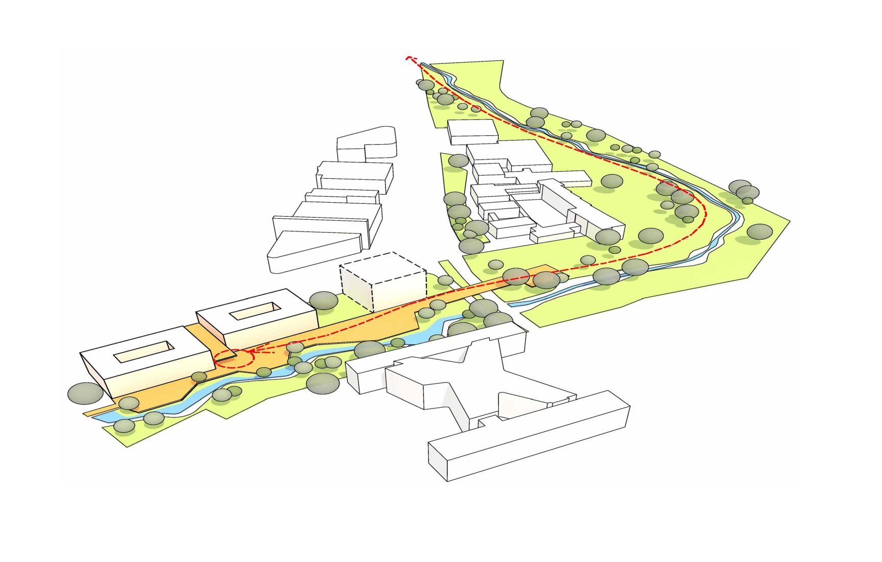 Durch die Gliederung vermittelt der Schul-Neubau zwischen den größeren Bauvolumen der Umgebung und dem Grünzug am Bleicherbach, den weiter westlich angrenzenden Wald- und landwirtschaftlichen Flächen und den ebenfalls über den Grünzug angeschlossenen süd-östlichen Bebauungen.