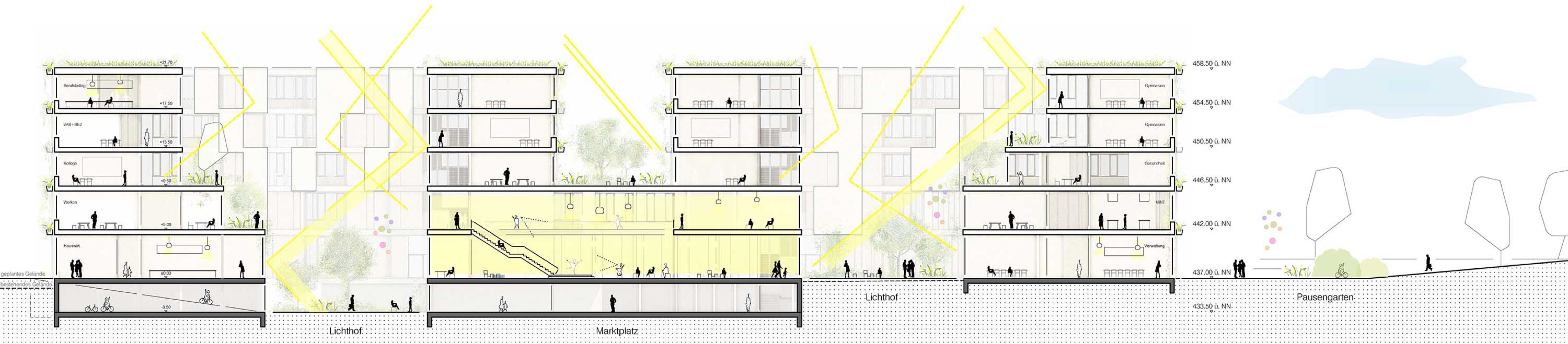 Das Gebäude soll neben begrünten Dachflächen auch mit begrünten Fassaden und Begrünungen im Innenraum versehen werden… das Gebäude als Teil des Grünzugs.