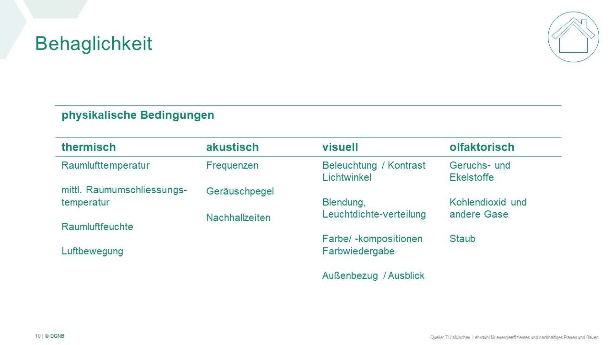 Bei dem komplexen Thema „Gesundheit & Nutzerzufriedenheit“ werden grundlegende Kenntnisse zu den Themen Komfort und Behaglichkeit (Thermisch, Visuell, Akustisch, Olfaktorisch) und Schad- und Risikostoffe vermittelt.
