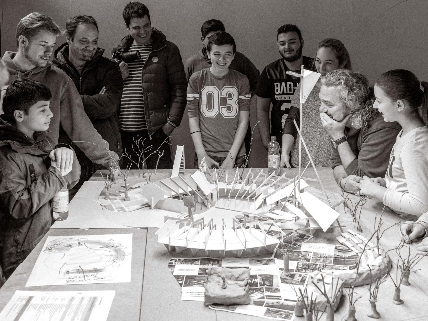 Bei unserer Arbeitsweise mit Kindern wird jede Klasse von einem unserer Architekt*innen durch den workshop begleitet. Es fängt damit an, dass die Schüler*innen sich selbst und ihre Schulmöbel im Maßstab 1/10 modellieren, um herauszufinden, wie viel eine Klasse an Raum benötigt. Dann wird um diese Modelle herum mit Holz eine Hülle nach den Ideen der Schüler*innen gebaut. Während des Modellbaus durchlaufen die Schüler*innen ganz von selbst die konstruktiven und technischen Probleme, die dann gemeinsam diskutiert und mit der Hilfe der Architektin / des Architekten gelöst werden. Sobald die Klassenhäuser fertig sind wird die ganze Schule zusammengestellt. Jede Klasse präsentiert und erläutert dann seinen Mitschüler*innen stolz ihren Entwurf.