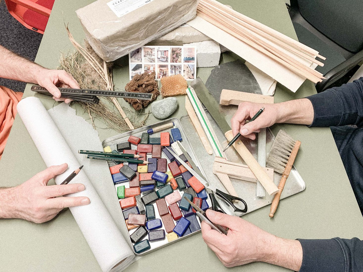 Meist geht es hier erstmal um den Masterplan, das Grund-Layout des jeweiligen Projekts. Wir haben für jede Gruppe Lageplan und Raumprogramm im selben Maßstab vorbereitet. Der Lageplan ist das Spielfeld, das Raumprgramm wird auf Ton aufgeklebt und ausgeschnitten, das sind die Spielsteine.